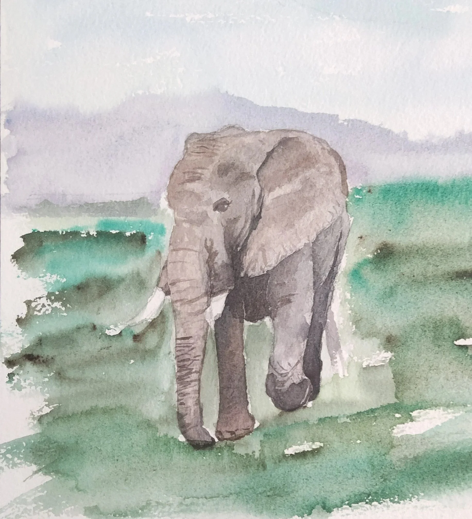 A majestic elephant walking across the open savannah, painted in soft watercolor tones. The warm landscape and gentle light capture the peaceful beauty of the African wilderness, making this artwork perfect for prints, decor, and gifts for wildlife lovers.