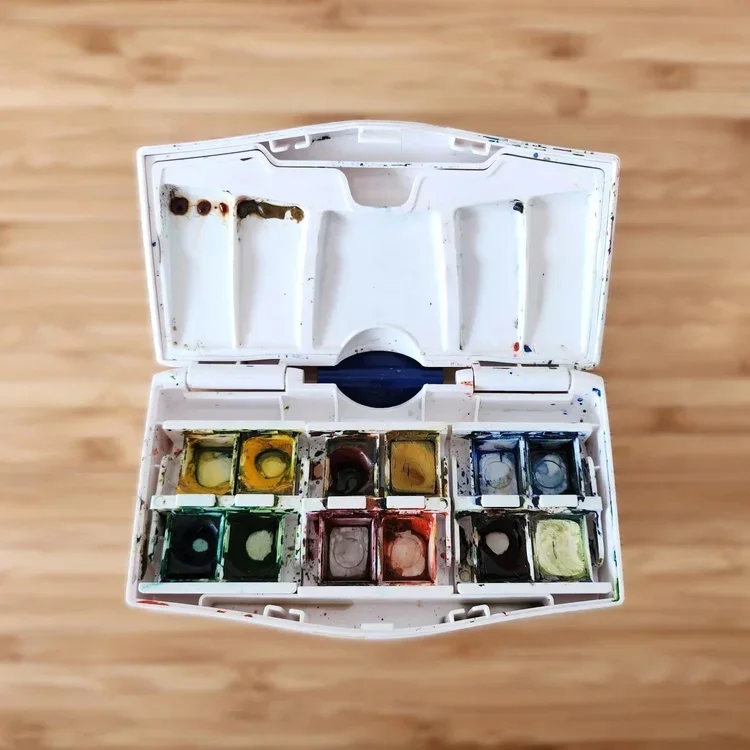 Watercolor paints come in pans (dry and compact, great for beginners and travel) or tubes (more concentrated, better for mixing larger amounts). Quality-wise, student-grade paints have more fillers and less pigment, while artist-grade have richer colors and better lightfastness. A small artist-grade set of 6–12 colours will always outperform a large student-grade one — and you can mix almost anything from a limited palette.
